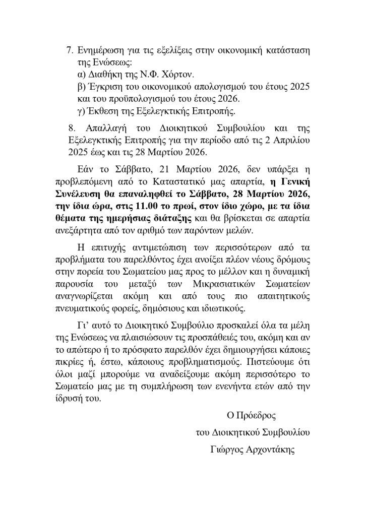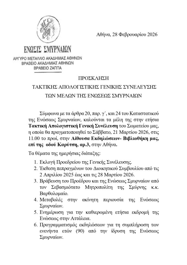 Πρόσκληση Τακτικής Απολογιστικής Γενικής Συνέλευσης των Μελών της Ενώσεως Σμυρναίων